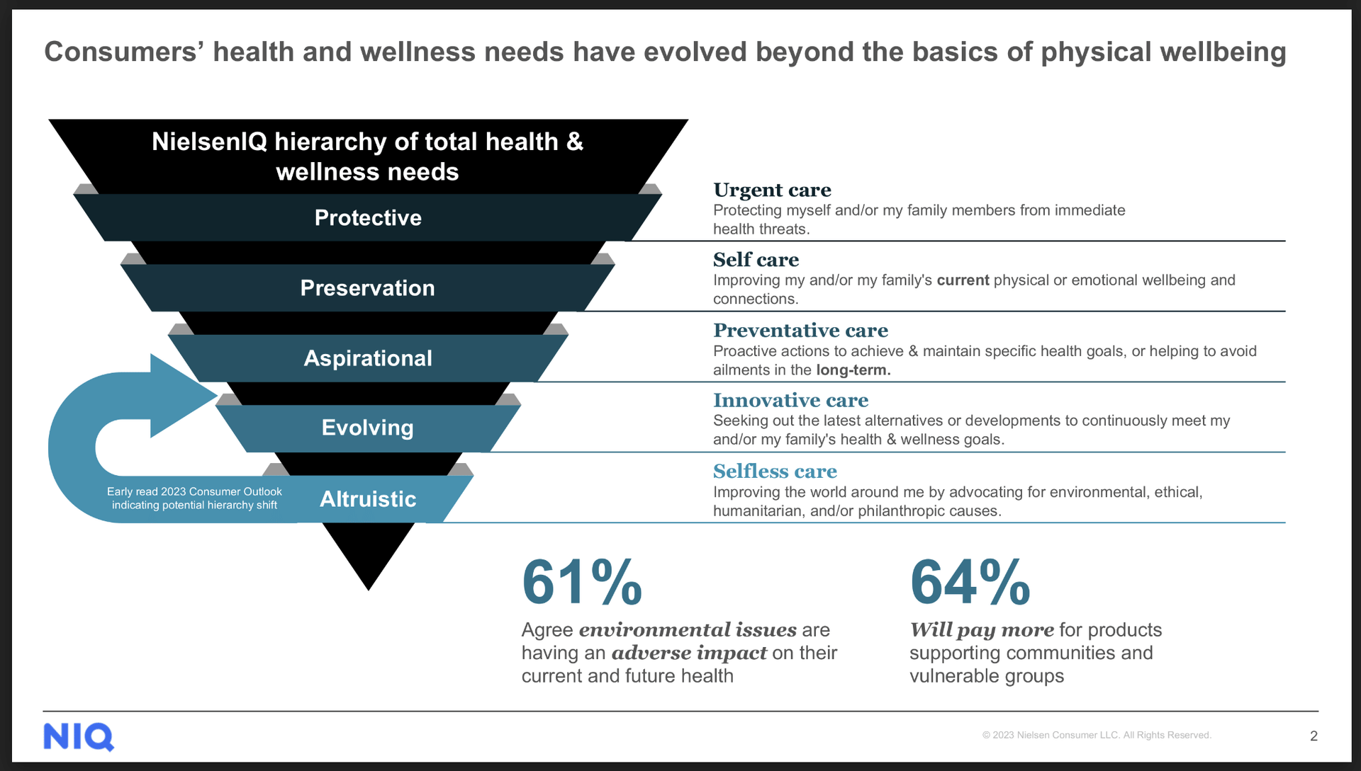 It’s not enough to demonstrate that you’re just affecting positive change, it has to also taste great. Plus, brands need to lead with value propositions that resonate with consumers' most-prized needs. See below for a graphic from Nielsen IQ demonstrating "altruistic" needs as the fifth and final slot in the hierarchy behind protective, preservation, aspirational, and evolving needs.
